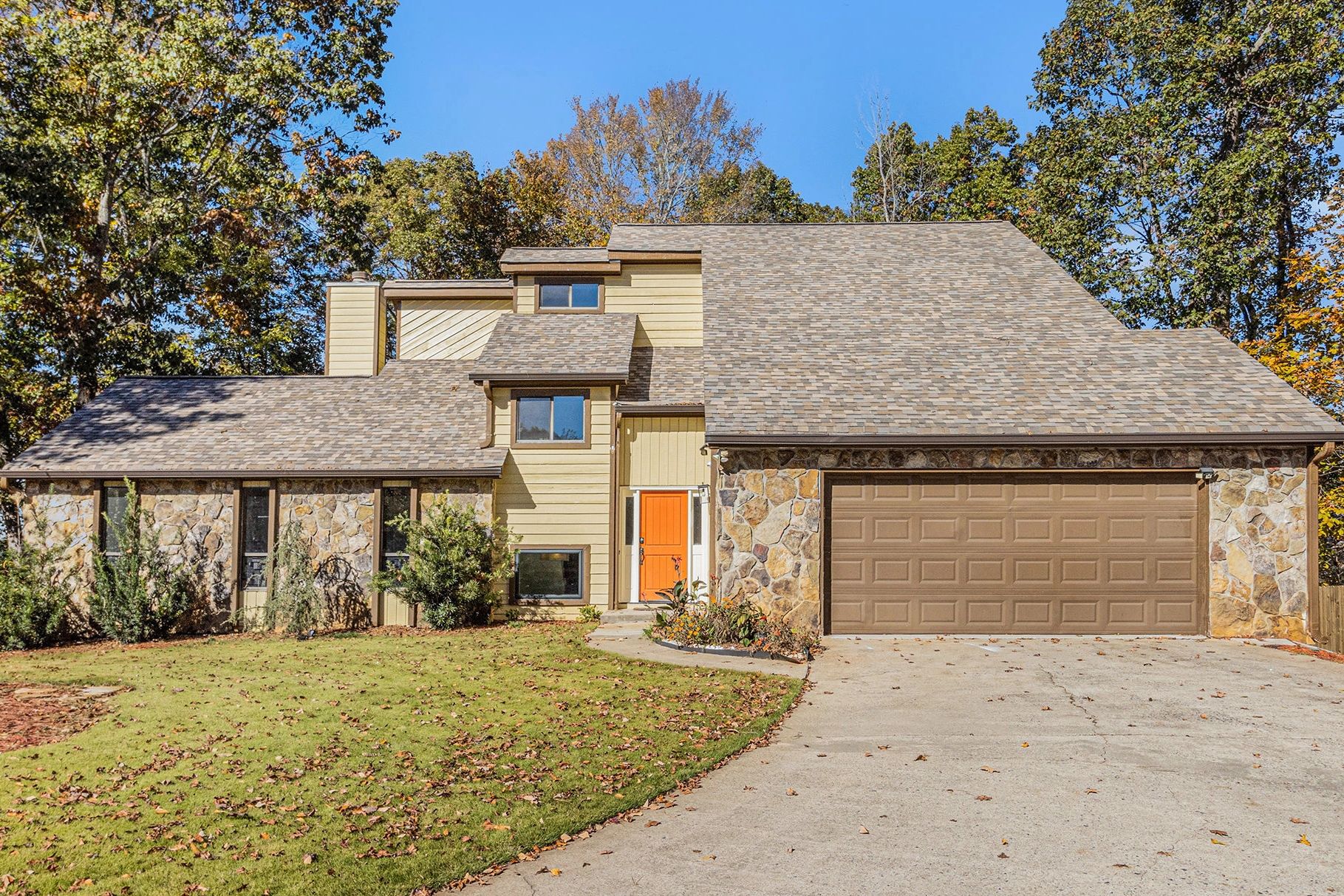The open eat-in kitchen boasts abundant granite counter space, a bright breakfast area overlooking a tree-lined landscape, and seamless access to the dining and sunken living rooms ideal for entertaining. Architectural details such as stacked stone accents, updated staircases, and ample natural light enhance the warm ambiance. Additional highlights include multiple walkout decks, a newer roof, refreshed bathrooms with double vanities on the upper level, a laundry room with a sink, plentiful storage, fresh paint, and a semi-finished terrace level with interior and exterior access, stubbed for an additional bathroom, offering flexibility for future expansion.